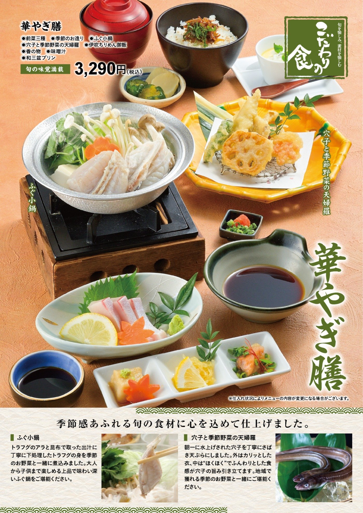 The menu of "Monthly set" changes every month. This is our specialty, with many customers coming to our restaurant every month to eat this seasonal meal that uses plenty of seasonal ingredients.