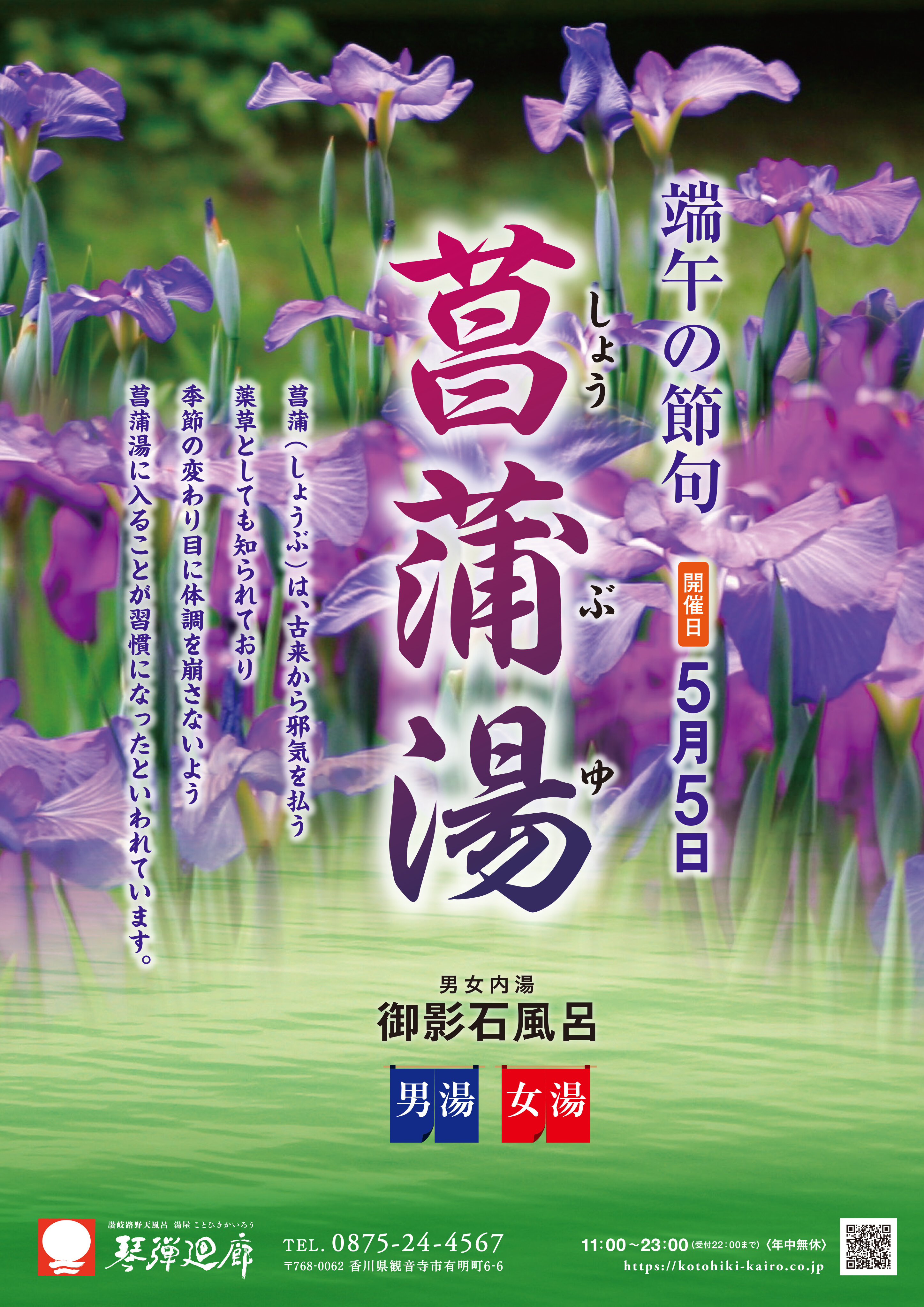 5月5日『こどもの日』は菖蒲湯します 2026/4/28 | イベント 5月5日(木)こどもの日は恒例の菖蒲湯を開催致します。 菖蒲は、古来から邪気を払う薬草としても知られており、季節の変わり目に体調を崩さないよう 『菖蒲湯』に入るといわれています。 ゴールデンウイークは琴弾廻廊にてどうぞごゆっくりお過ごし下さい。皆様のご来館お待ち申し上げております。 facebook twitter line