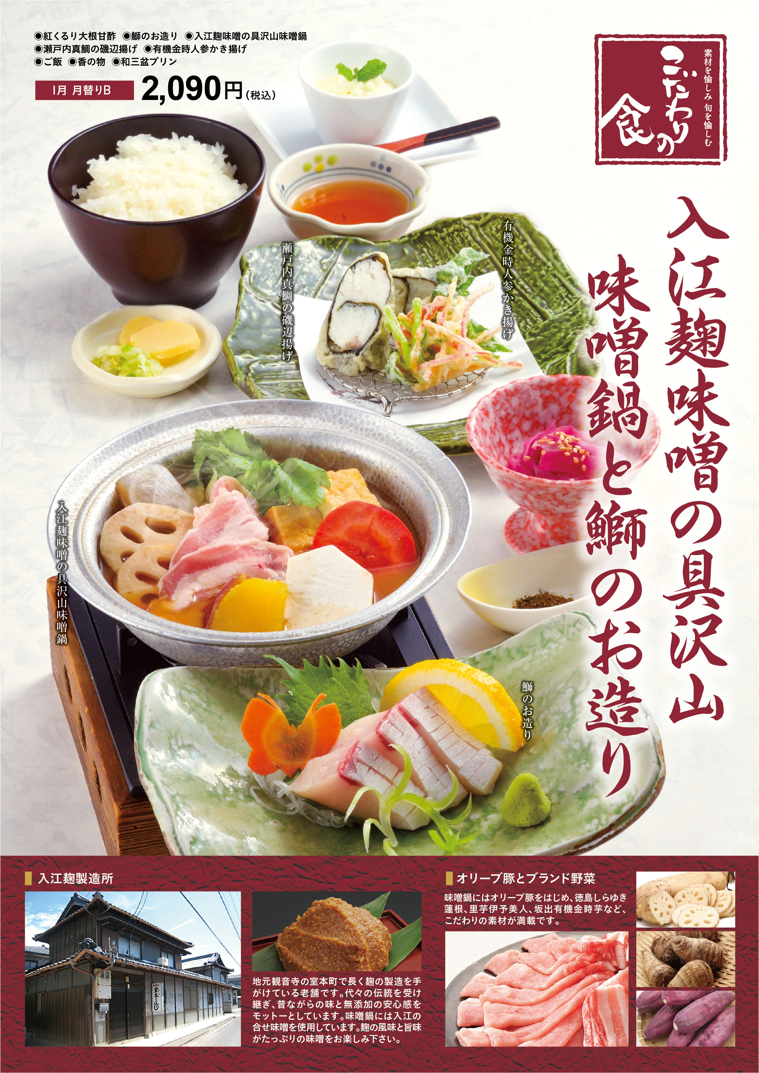 1月の月替りメニューは、具沢山な味噌鍋がメインです。使用している味噌は、地元『入江麹製作所』で手間ひまかけて作られています。入江麹製作所は地元観音寺の室本町で、長く麹の製造を手がけている老舗。代々の伝統を受け継ぎ、昔ながらの味と無添加の安心感をモットーとしています。