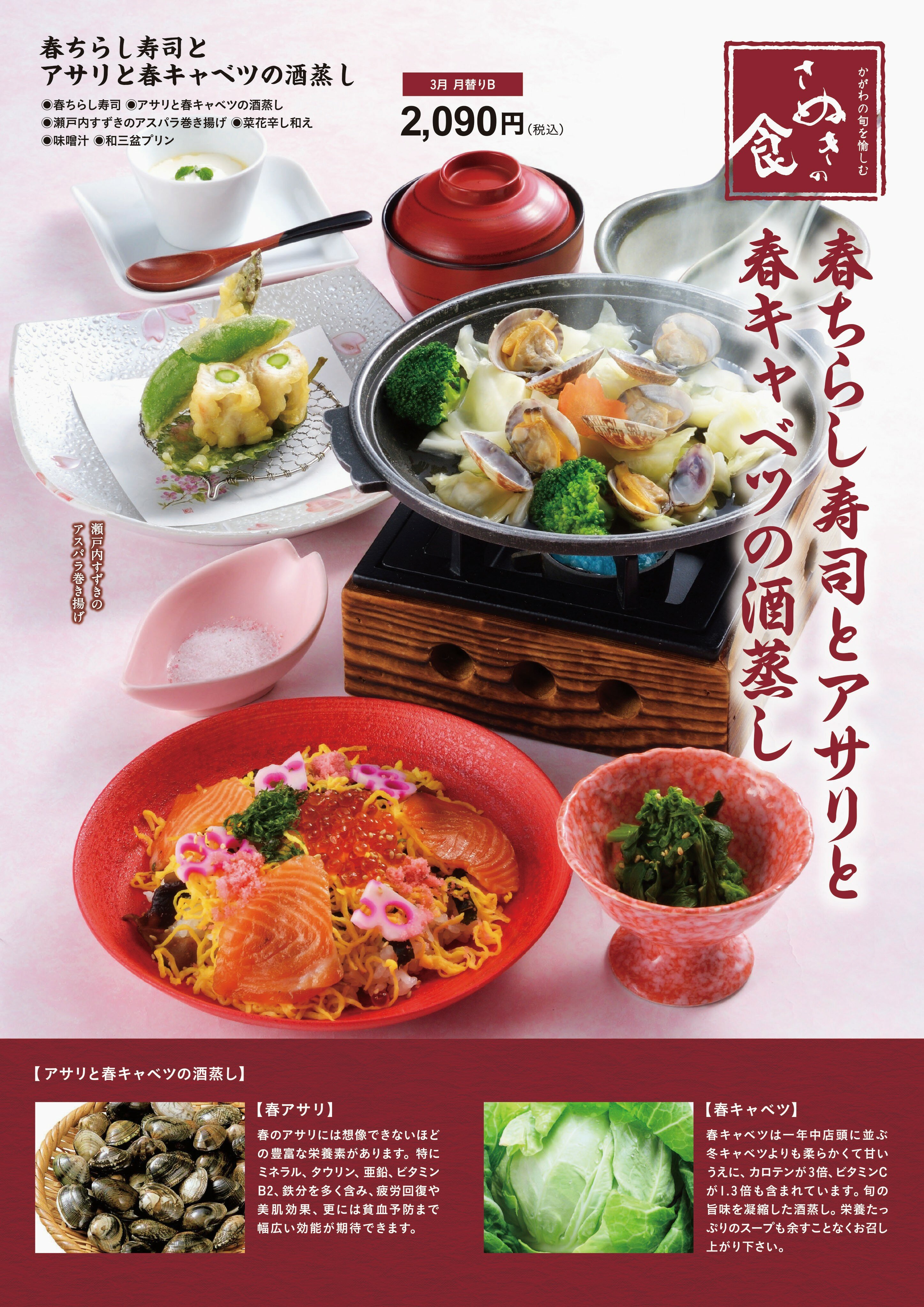 3月 月替り膳のお知らせ 2026/2/28 | メニュー 3月の月替わりメニュー。「さぬきの食」をテーマに地元の素材を使用した内容をご用意しました。 仁尾酢を使用した『春ちらし寿司』は、たっぷりのオリーブ玉子とサーモンをのせ、イクラをトッピングした春らしいちらし寿司です。香川県産のすずきとアスパラガス(さぬきのめざめ)の天婦羅、アサリと春キャベツの酒蒸しもセットした月替わり膳です。 さぬきの食を存分にお楽しみ頂ける内容です。是非一度ご賞味ください。 facebook twitter line
